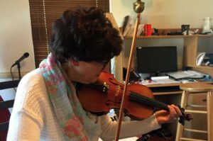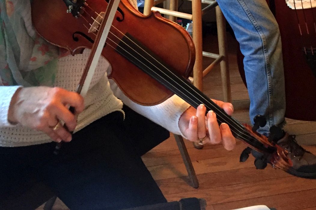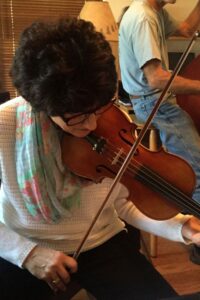 In playing Old Time music there needs to be a lead melody instrument. Traditionally, this is the fiddle and we have done well using the banjo and mandolin as our lead. However, we have longed hope that a fiddle player would emerge from our family and she has.